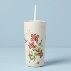 Lenox Blue Bay Leaf Stainless Steel Tumbler With Straw