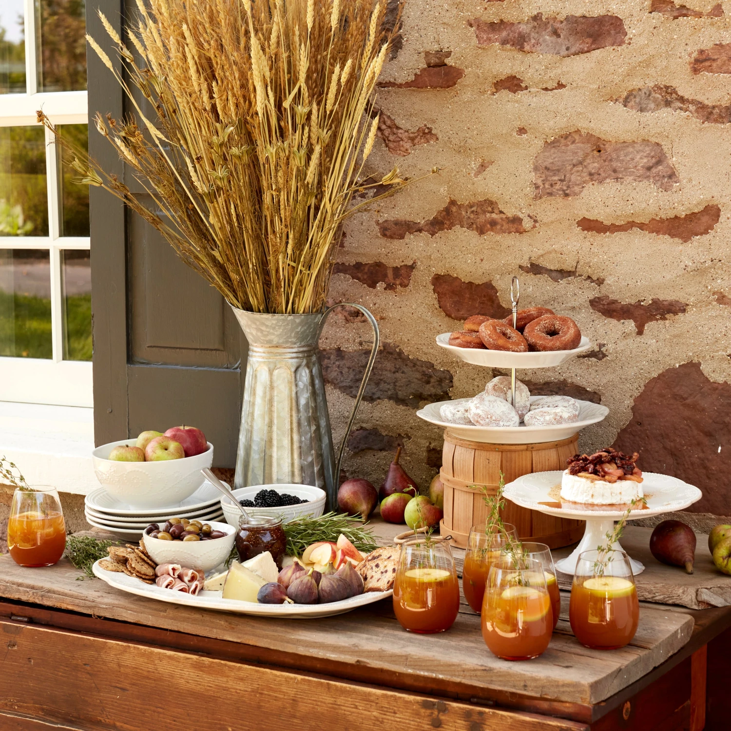 This two-tiered durable white ceramic stoneware server shines with a subtle texture of raised beads along its scalloped border as a delicate hand-applied tea stain adds a touch of country quaintness to the piece. This item is hand-wash only.